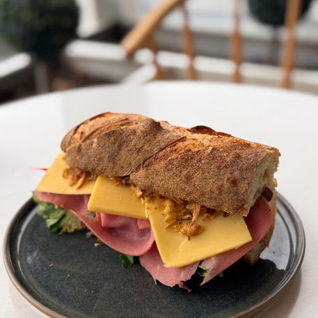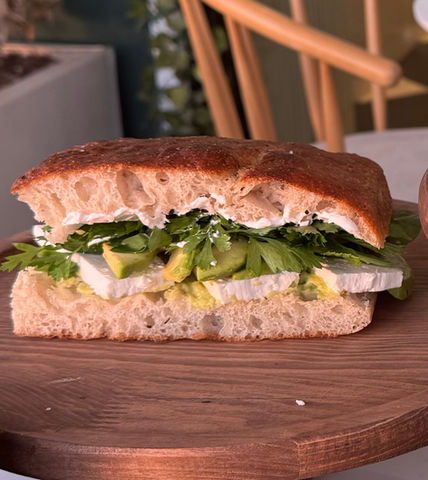 Focaccia ekmeğinde Chef Dana Jambon, Suda Mozarella, İtalya'nın Taze Pestosu, Ricotta, Roka ve Lolorosso